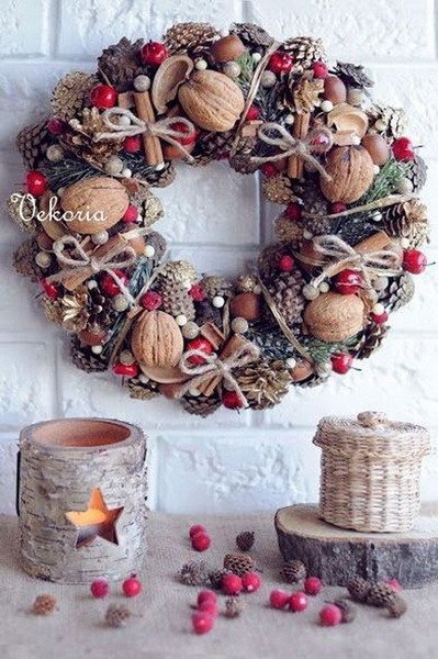 Such Christmas wreaths can be formed from cones, nuts, acorns, shells, Christmas decorations, dried fruits, burlap, special ribbons, etc.